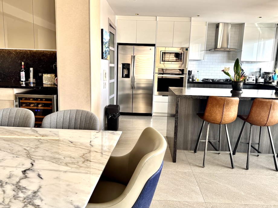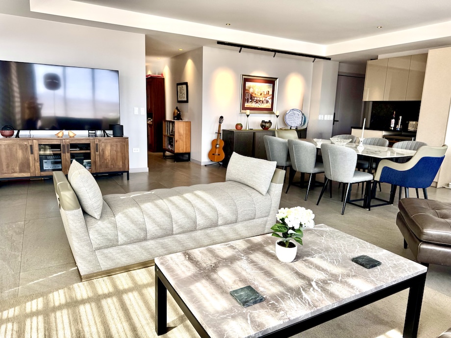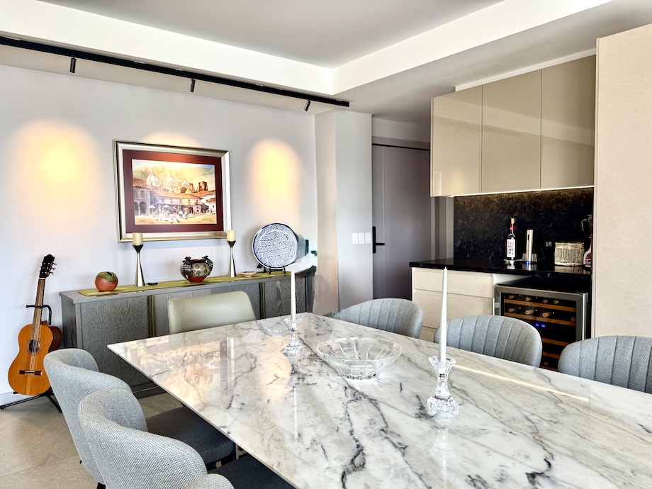 The apartment is also fully equipped as a smart home, with Lutron dimmable lighting, imported Danish fixtures, and strategically placed art lighting that enhances the evening ambiance. Fiber internet and extensive CAT 6 wiring ensure strong connectivity throughout, and the system is Google Home–ready for those who prefer voice-controlled living, while remaining simple to operate manually.
