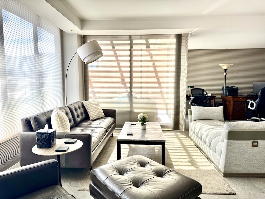 To protect the interiors from the equatorial sun while preserving the views, the owners installed $25,000 worth of electro-mechanical Hunter Douglas remote-controlled blinds, offering both sheer and blackout options. The pergola glass is double-paned with a UV-coated interlayer, creating a comfortable, climate-conscious environment year-round.