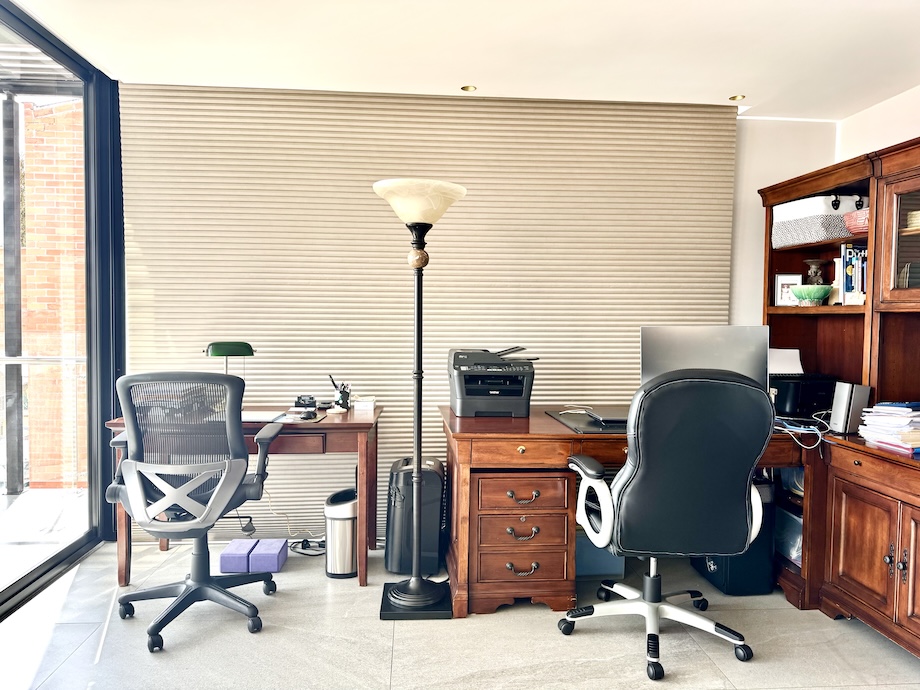 The open-concept living, dining (a more formal area), and kitchen area is perfect for entertaining, and add the outdoor space, and let the party begin. It's also great for family functions. All on one floor, the lliving area also offers an alcove where there are currently two desks, perfect for remote workers.