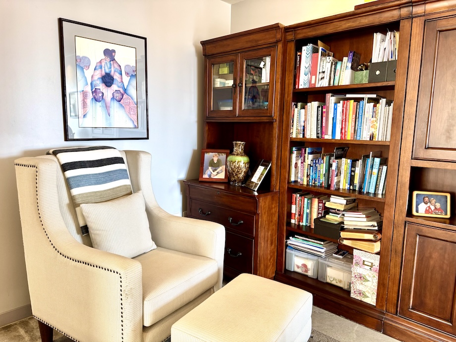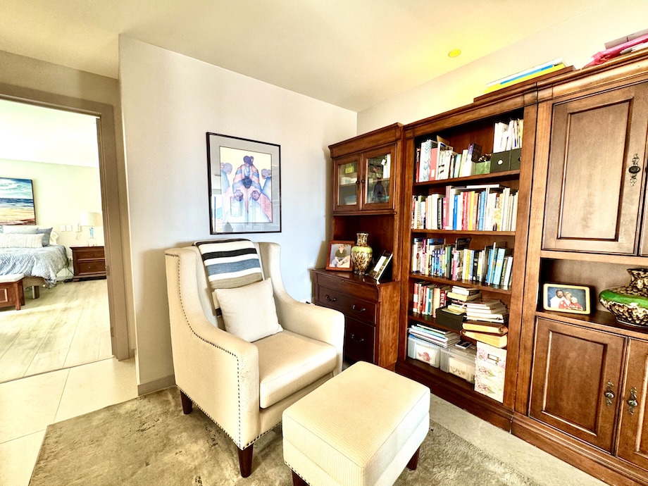 A hallway seating area, currently used as a small library, offers yet another moment for a quiet retreat inside the apartment — a place to read, reflect, or even sneak in an afternoon nap. Storage throughout has been thoughtfully designed, including extensive custom cabinetry and a rare, generously sized linen closet with drawers and shelving that make everyday living feel organized and effortless.