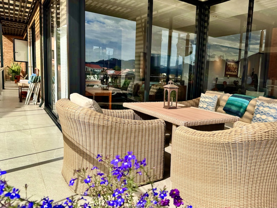 From the moment you enter, the space opens wide to light and jaw-dropping views. Floor-to-ceiling glass doors line the exterior walls, drawing in the changing skies and soft mountain light from the Cajas to the west. The effect is immediate — a sense of openness, calm, and quiet sophistication. The indoor and outdoor spaces blend seamlessly here, with covered pergolas extending the living areas outward, creating a flow that makes everyday life feel expansive and relaxed.