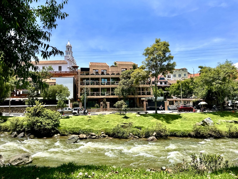 The beautifully terraced, modern building has an entrance next to the church on Calle Larga -- a street filled with fine restaurants, high-end boutiques, cafes, artisan and craft shops, bakeries, a Mercado and museums. The structure then cascades down a tree-lined hill with a second entrance on the beautiful Tomebamba River and its river walk. Pet owners and nature lovers will revel in this exceptional place to walk or ride a bike. Elevators will be found near both entrances.