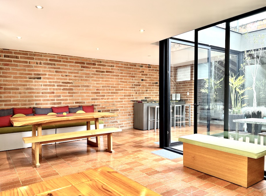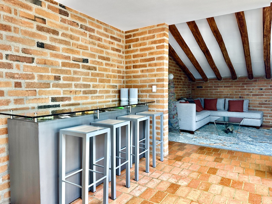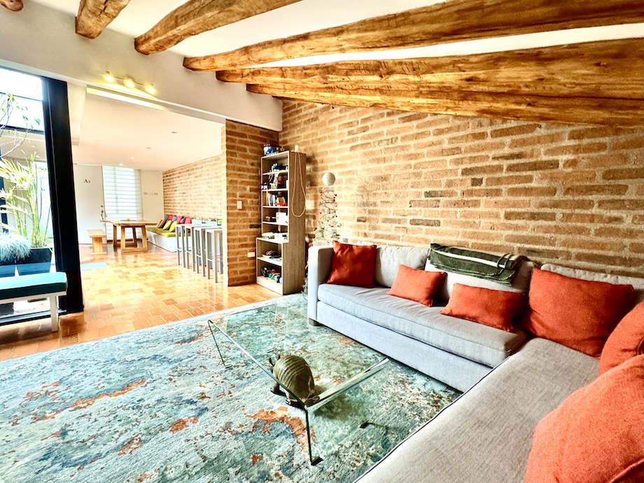 Slanted and angular ceilings, exposed brick walls, arisinal brick floors, wooden beams, and designer accents make this apartment a show-stopper, while the upstairs terrace is the perfect party venue, offering views of downtown's red-tiled rooftops and the city's newer areas. The glass-enclosed solarium comes with a small table and chairs, plus plants that bring the outdoors, inside.