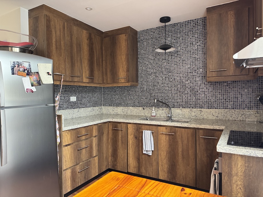 The unit also comes with appliances, including a stove, range hood, oven, refrigerator, and microwave. The kitchen features a high-top table and stools for casual dining. A hand0crafted, metal and glass bar with stools serves as an alternative place for guests to eat and drink while socializing with the host in this open-concept getm.