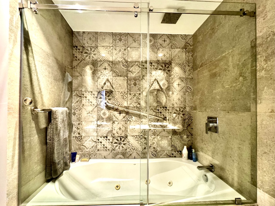 The home offers two spacious bedrooms, each with its own ensuite bath and direct connection to the terraces, allowing light and fresh air to be part of the daily experience. The primary suite is a true retreat, with additional custom closet space and a beautifully appointed bathroom featuring double Kohler Artist Series sinks, a Toto washlet bidet, and an oversized jacuzzi tub — a quiet place to unwind at the end of the day.