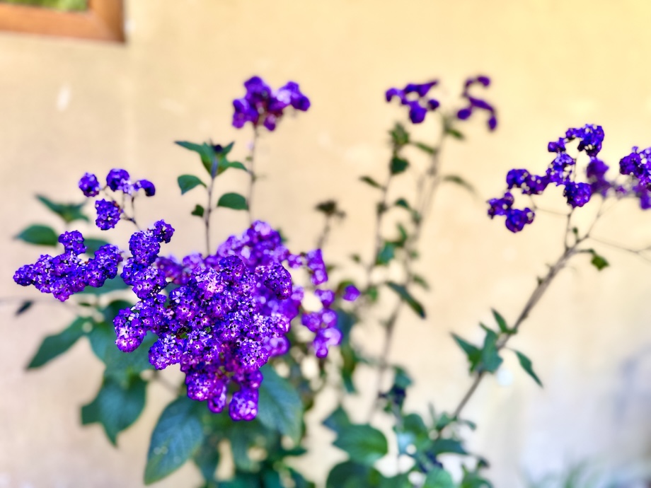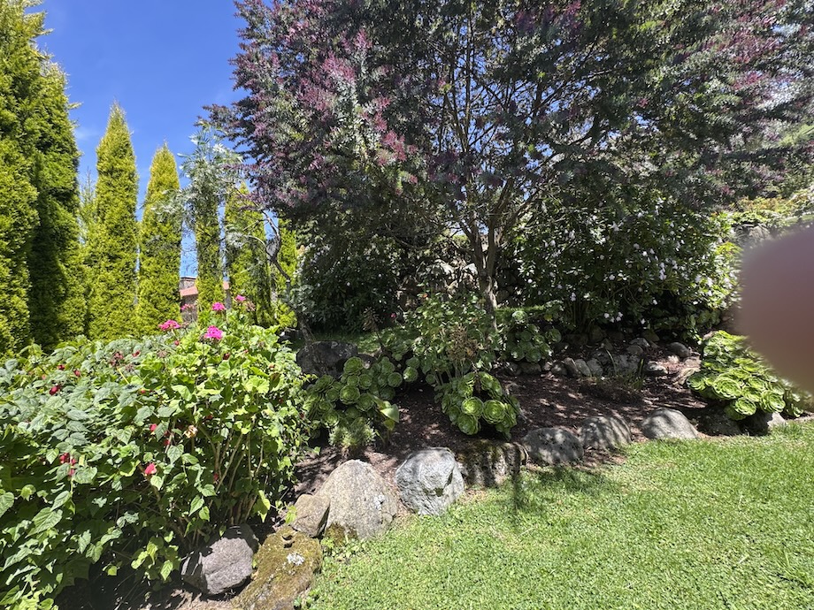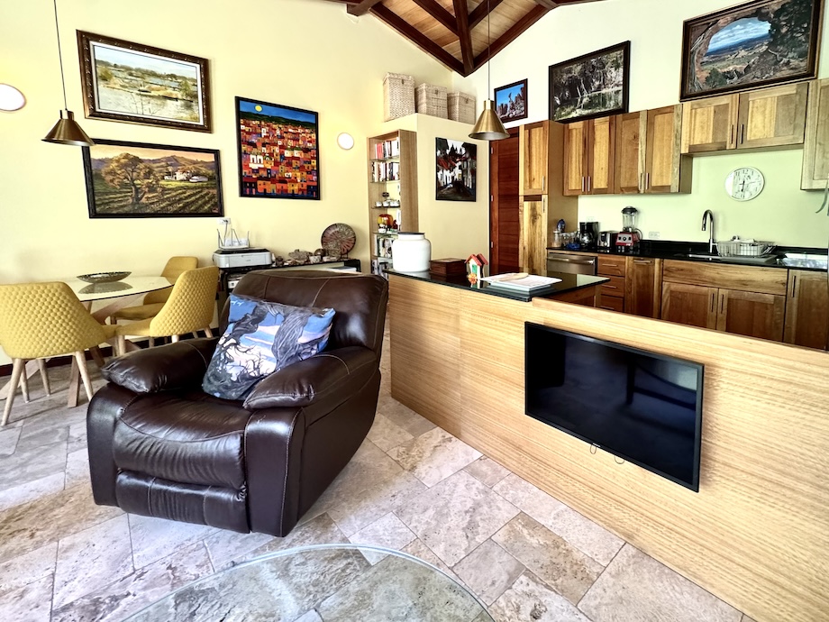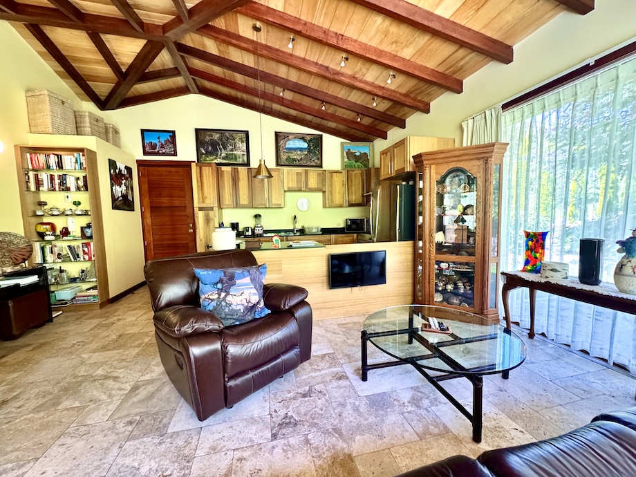 The open-concept living, dining, and kitchen area is filled with natural light, with wood-beamed ceilings and a relaxed layout that immediately feels welcoming. The living room has a cozy fireplace—perfect for cooler mountain evenings—while large sliding glass doors open to a private, two-sided patio accessible from both the living area and the bedroom. Surrounded by grass, trees, and flowering plants, this outdoor space becomes a natural extension of the home. The floors are also heated.