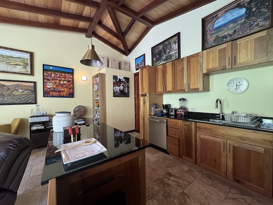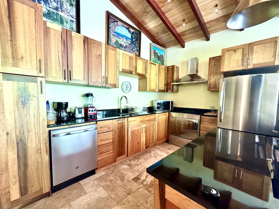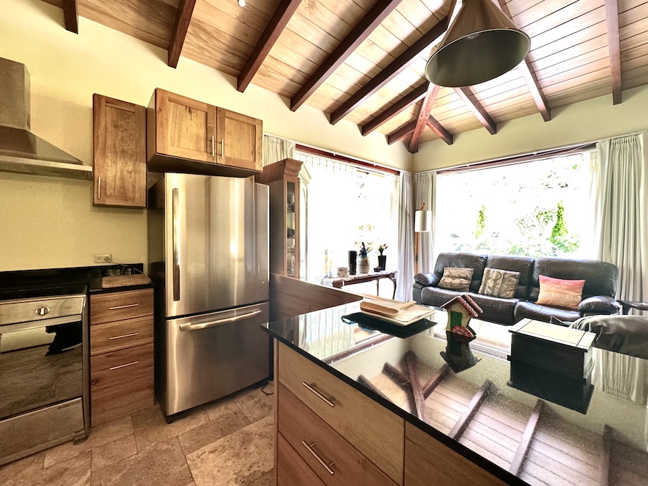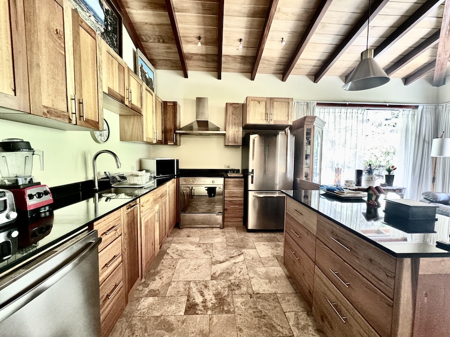 The kitchen is both functional and inviting, with warm wood cabinetry, a generous island, and plenty of space to cook, gather, and entertain. It comes fully equipped with an induction cooktop, oven, refrigerator, dishwasher, microwave, range hood, and ample storage throughout.
