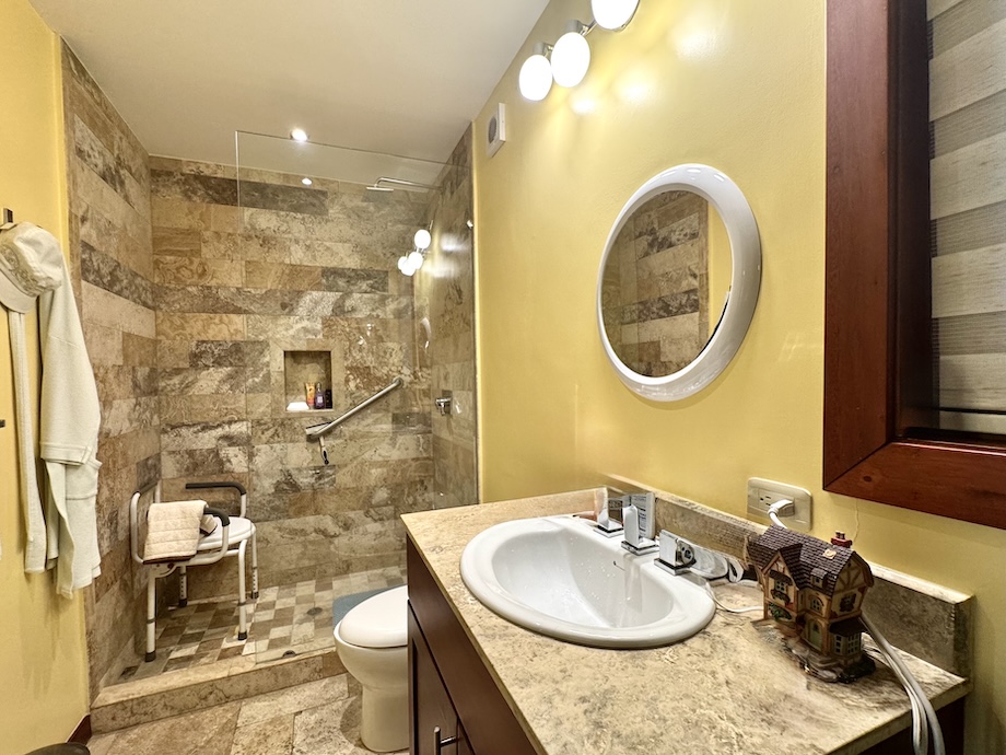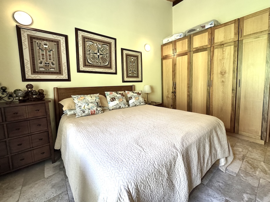 The bedroom offers a peaceful, spacious retreat with easy access to the patio and views of the surrounding gardens and mountains. A well-appointed travertine bathroom and thoughtful details throughout—such as solid-wood doors and finishes, UV-protected, sound-insulated windows, and North American construction standards—enhance the home’s comfort and ease. A washer and dryer are conveniently located inside the large en-suite bathroom, which has separate doors leading from both the bedroom and the living space.