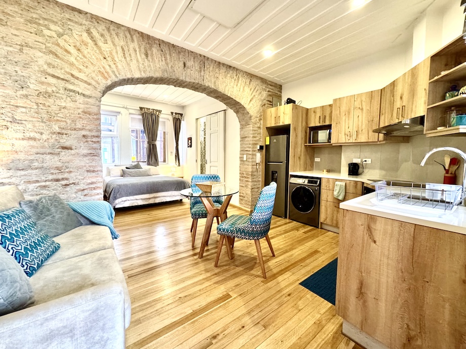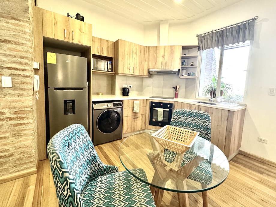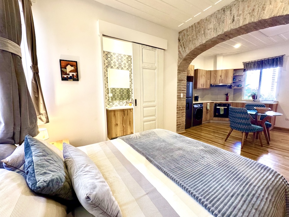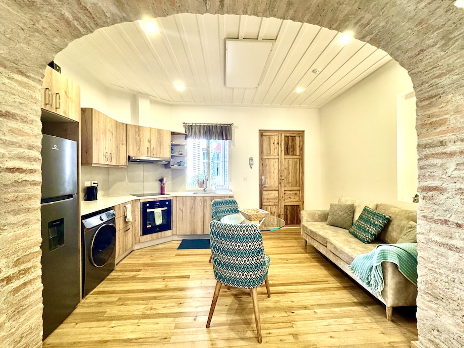 This darling, turnkey suite in one of Cuenca’s most coveted buildings in the historic district is the perfect rental property or pied-à-terre. Casa del Huerto—a beautifully executed renovation within a historic colonial building—is ideally located in the heart of downtown, just one block from the Tomebamba River and its scenic walking and bike paths. A nearby bridge connects you effortlessly to the newer part of the city, where restaurants, hospitals, and modern conveniences are all within easy reach. And, Parque Calderon — the center of El Centro — is a mere 5 blocks away.