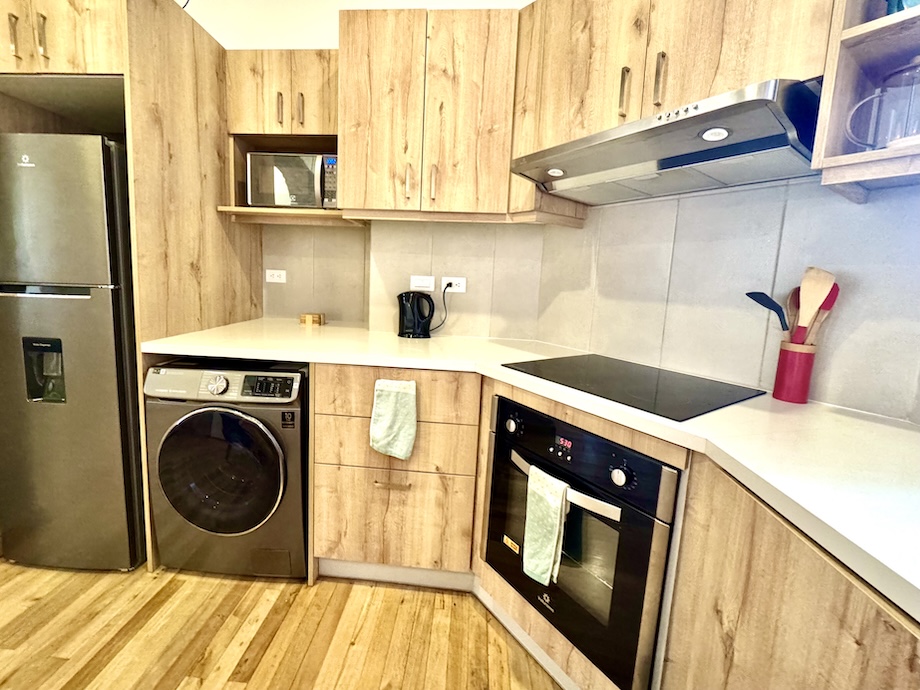 The fully furnished unit comes complete with all appliances, including a refrigerator, stove, oven, range hood, dishwasher, and a washer/dryer combination—making it truly turnkey and ready for immediate use or rental. A comfortable sofa, dining table with two chairs, and tasteful finishes throughout create a space that feels both cozy and elevated.