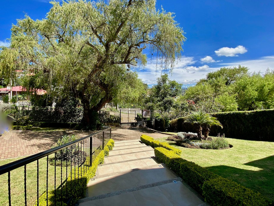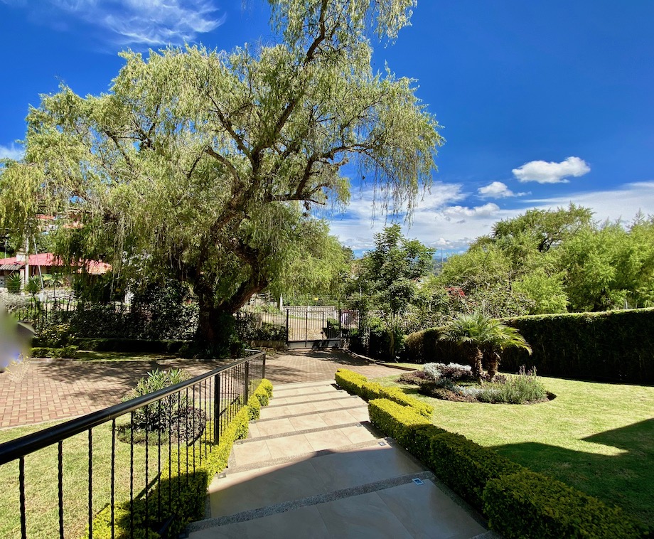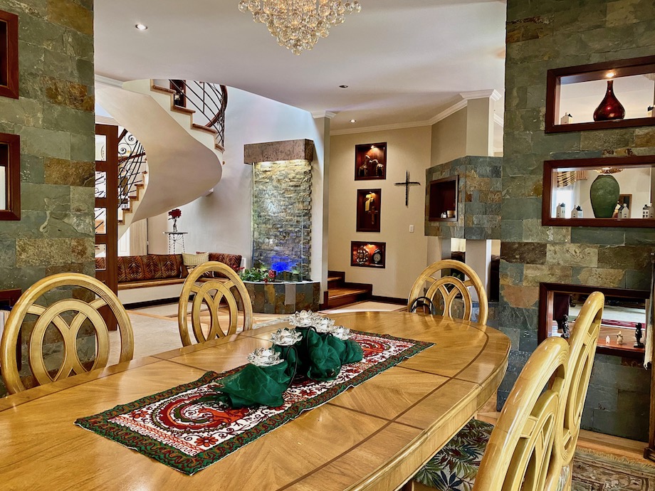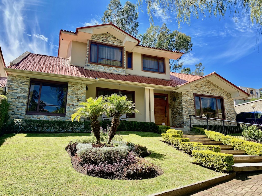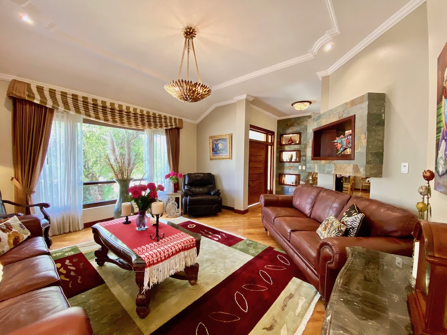 This lavish 4.000 square foot upscale Challuabamba home, just 20 minutes from downtown Cuenca, offers four bedrooms and five baths, an inviting living room, a formal dining room, a kitchen with high-end appliances and granite countertops, a breakfast nook, two TV rooms, an office built for two, an opulent master en suite ground floor bedroom, a wonderful bistro sunroom and three terraces. This enchanting property also boasts a separate outdoor kitchen and entertainment area with spectacular mountain and valley views, plus two gorgeous Magnolia trees, two lemon trees, an avocado tree,and various other plants and flowering shubbery that create a beautiful garden. There is also a bonus room currently being used as an art studio, but perfect for a mother-in-law's suite, guest room, or office.
