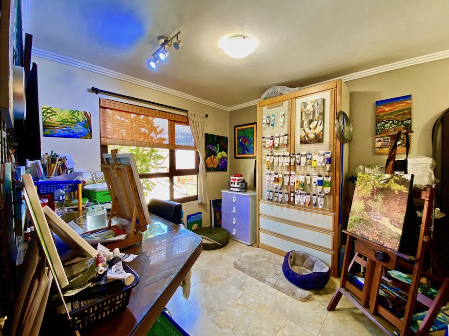 Floor-to-ceiling sliding glass doors welcome you to a patio and hillside backyard with stairs taking you to a fully-equipped outdoor kitchen that includes a soothing fireplace, a barbecue area, plus table and chairs. The current art studio, with an accompanying bathroom, could easily be turned into a workroom, a secondary guest suite, a maid's quarter, a game room, or extended to make a larger entertainment area. A floatation tank installed on a concrete pad with a changing booth and shower is located next to the house in the backyard and is perfect for relaxation and healing.