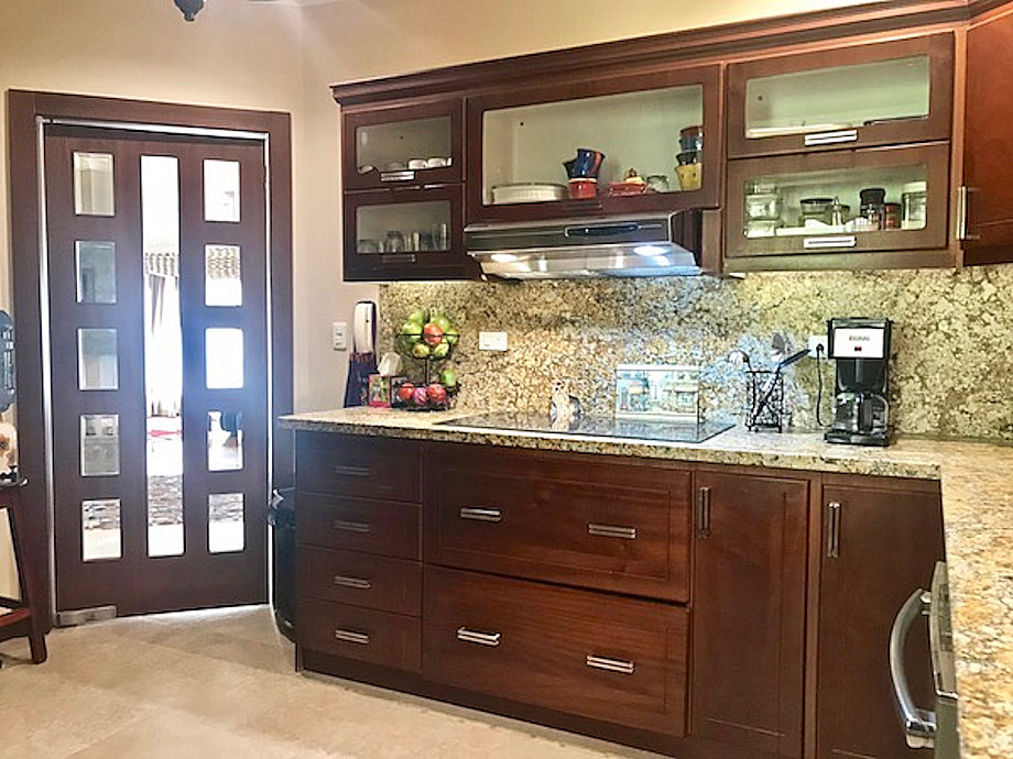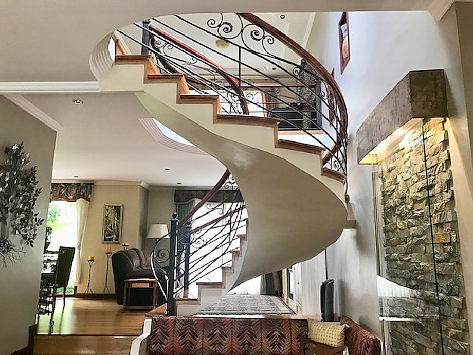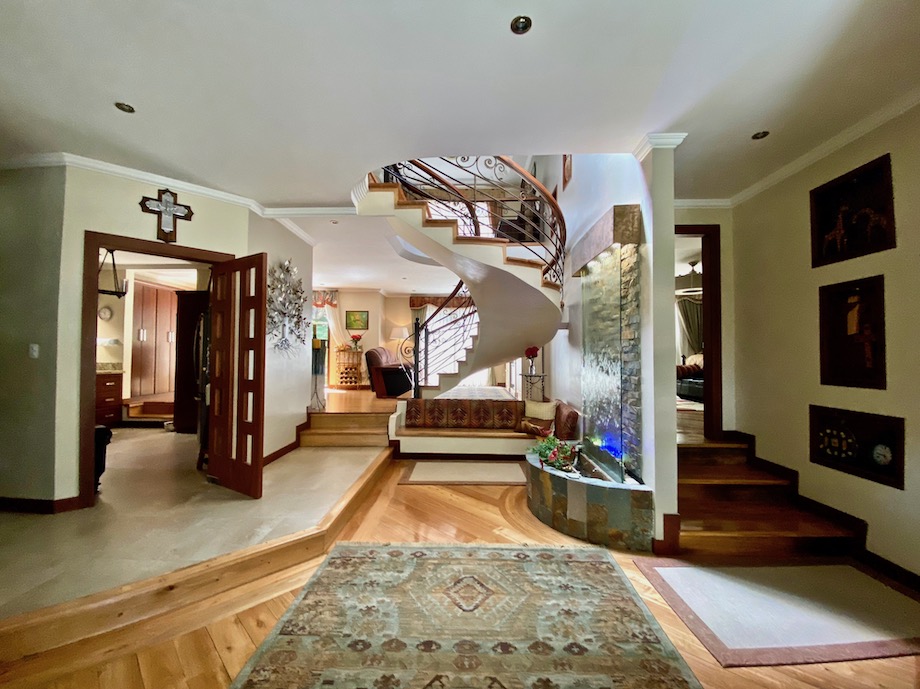 The stone and wooden home, with a red tile roof, is accessed behind an artful security gate and features a large brick driveway and a covered carport. A full security system is also installed. An impressive artisanal wooden door leads you into the home's lovely foyer and a view of the gorgeous spiral staircase.
