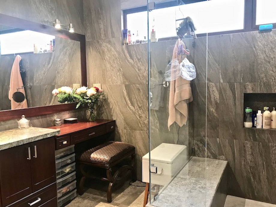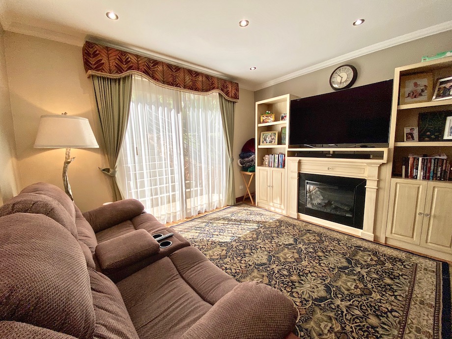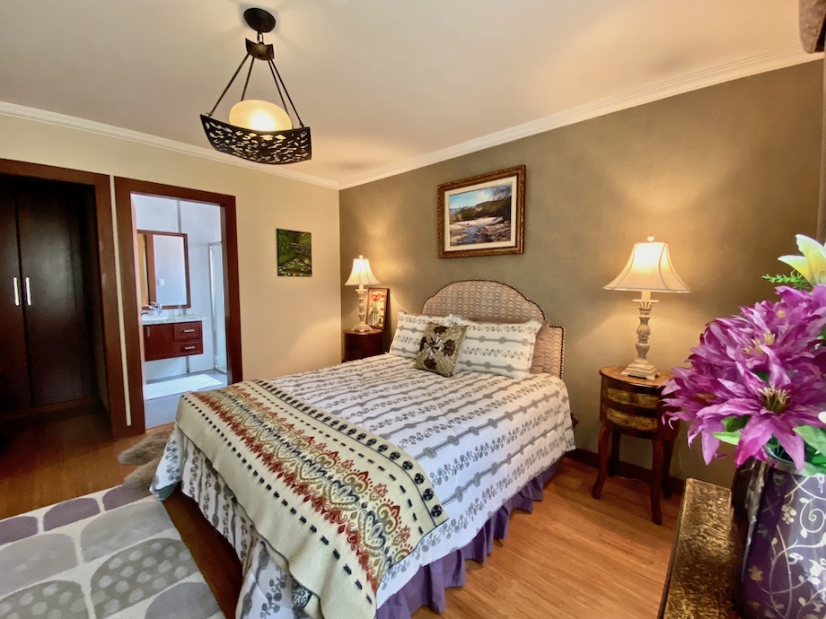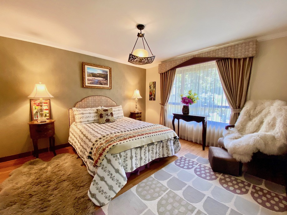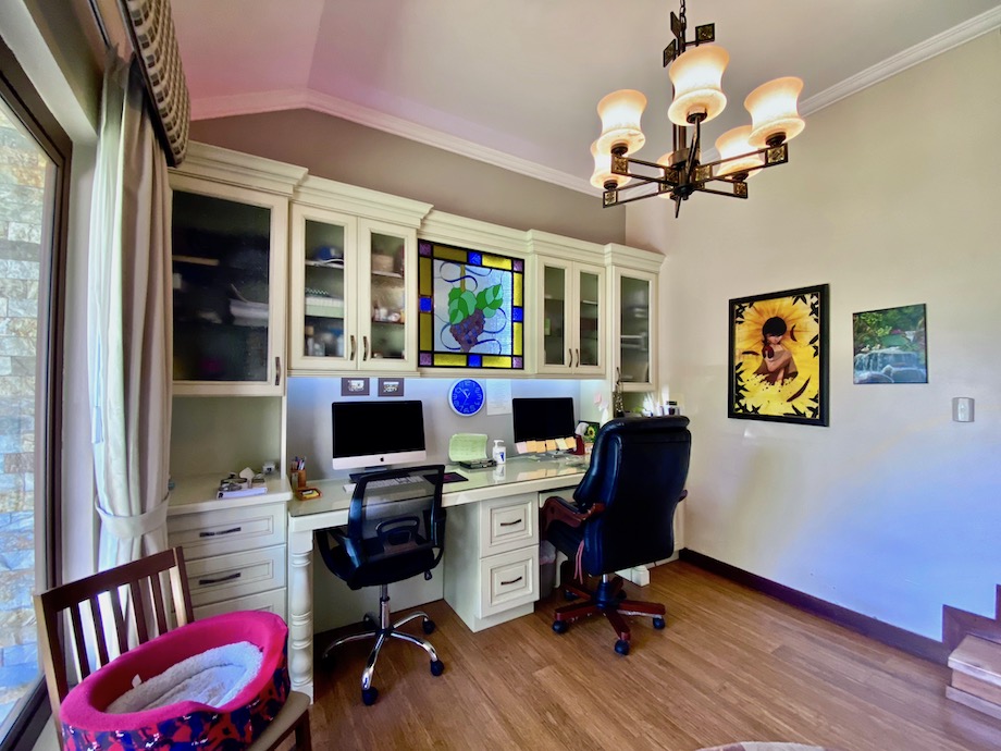 The large en-suite master bedroom is found on the ground floor with a walk-in closet and a shower with a shower seat. An office space with built-in desks and soft-hinge storage and file drawers with an exquisite custom-designed stained glass art piece is also found on the main floor and is big enough for two people with extra guest seating. This room could also be turned into a guest bedroom or work-out room as well.