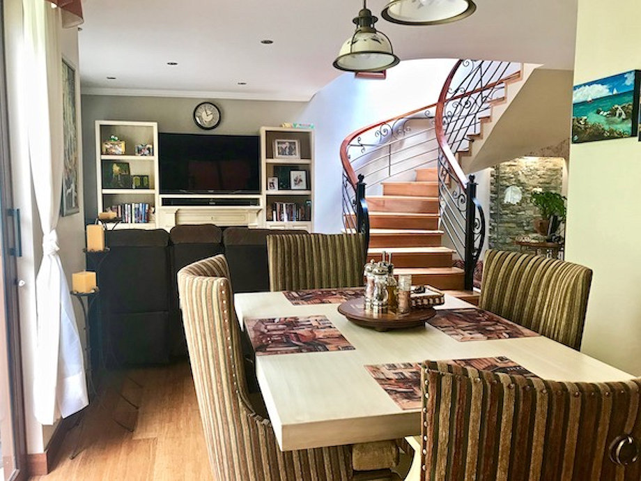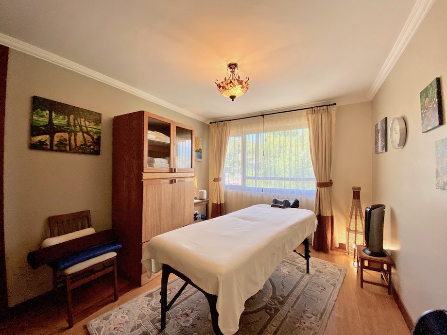 Climbing up the stunning wooden and wrought iron custom winding staircase, you are struck by the huge hand-crafted stained glass skylight. On the landing is a second TV room and the 3 guest bedrooms, one of which is en-suite. One of the bedrooms has been turned into a dedicated, spa-like massage room but could be a yoga studio or meditation area. A second bathroom is located on this floor shared by the 2 other bedrooms.