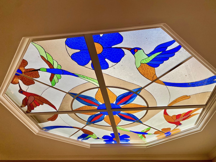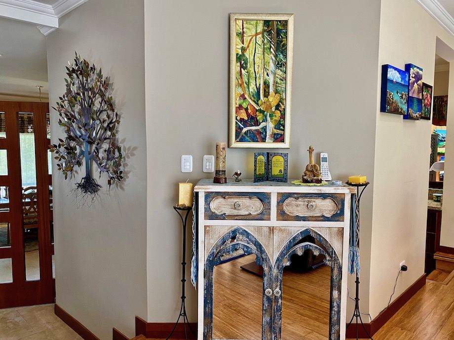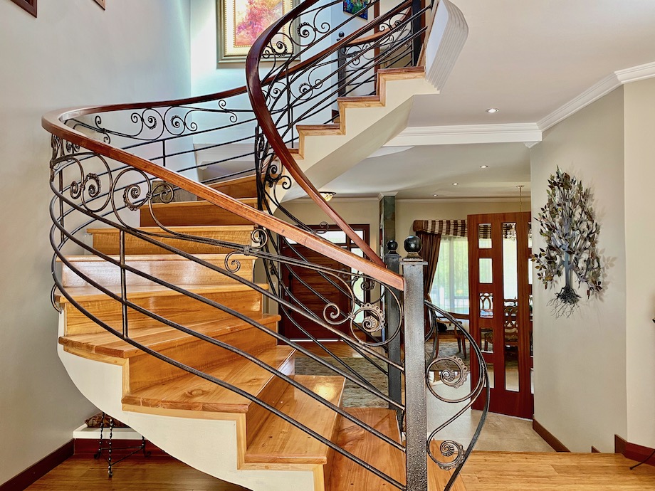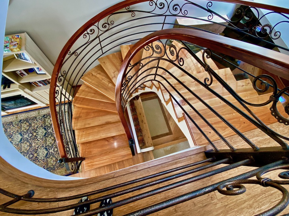 A hand-crafted wrought-iron spiral staircase, coffered ceilings, engineered hardwood floors, tile flooring and hand installed Eucalyptus floors, a stained glass skylight, and unique architectural details add to the charm of this one-of-a-kind home,